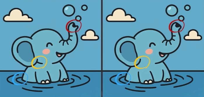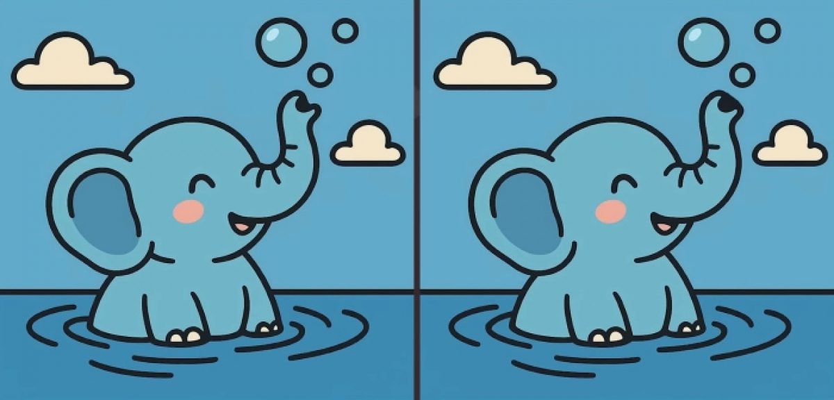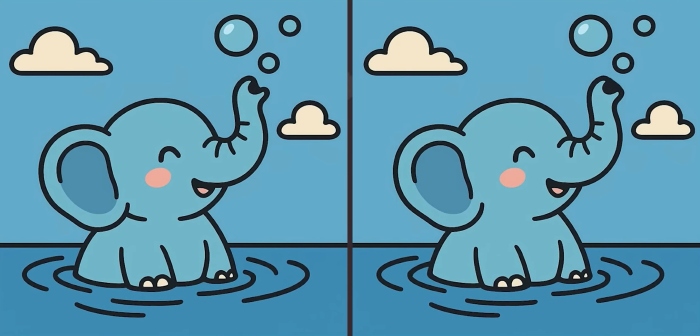 Štai dvi dramblio, žaidžiančio vandenyje, nuotraukos. Iš pirmo žvilgsnio jie visiškai identiški, tačiau tai tik iliuzija. Vaizduose paslėpti trys nedideli skirtumai.