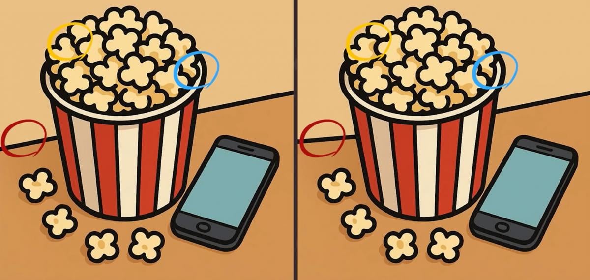 Štai dvi nuotraukos su kibiru spragėsių. Iš pirmo žvilgsnio vaizdai visiškai identiški, tačiau tai tik iliuzija. Tarp jų yra trys nedideli skirtumai.