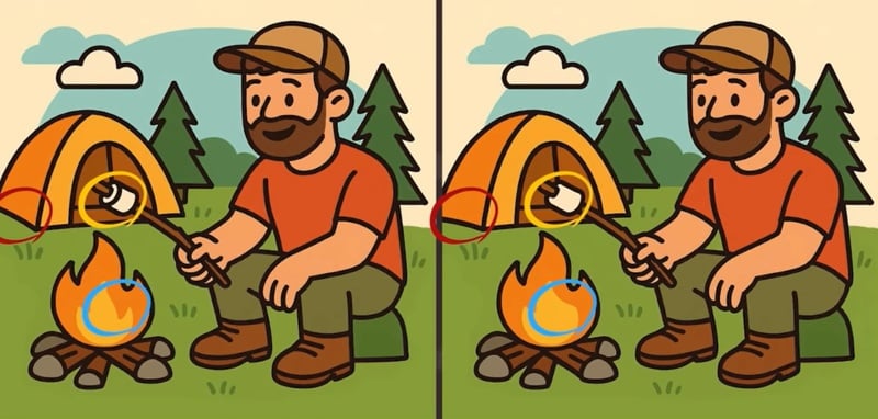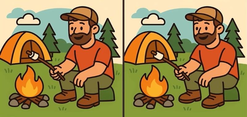 Šį kartą pažvelgsite į vaizdus, kaip vyras prie laužo kepa zefyrus. Iš pirmo žvilgsnio jie visiškai identiški, tačiau menininkas nuslėpė tris nedidelius skirtumus. Turite tik 51 sekundę, kad juos surastumėte!
