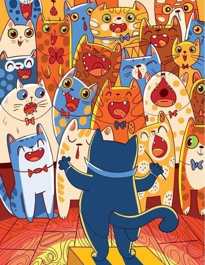 Dėlionės paveikslėlyje matote choru dainuojančių kačių grupę. Pilka katė pirmame plane yra choro lyderė, o kitos katės seka jį. Katės ruošiasi chorų konkursui ir joms reikia visos energijos. Choro dirigentas katinas savo grupei nupirko žuvies. Deja, viena iš godžių kačių suvalgė visą žuvį, o liko tik viena. Ar galite rasti paslėptą žuvį chore per 12 sekundžių?