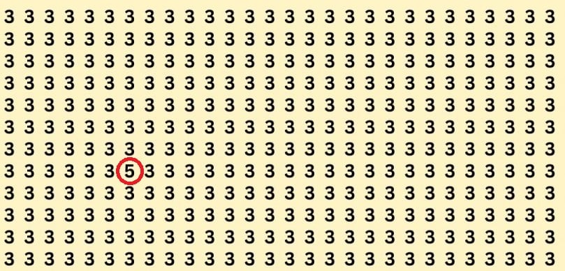 Paveikslėlyje matome daugybę skaičių 3, kurie yra išdėstyti eilėmis ir stulpeliais. Iš pirmo žvilgsnio atrodo, kad tarp jų nėra išskirtinių skaičių, tačiau iš tikrųjų taip nėra. Kažkur nepastebimai pasislėpę penki, kuriuos rasti nebus lengva.