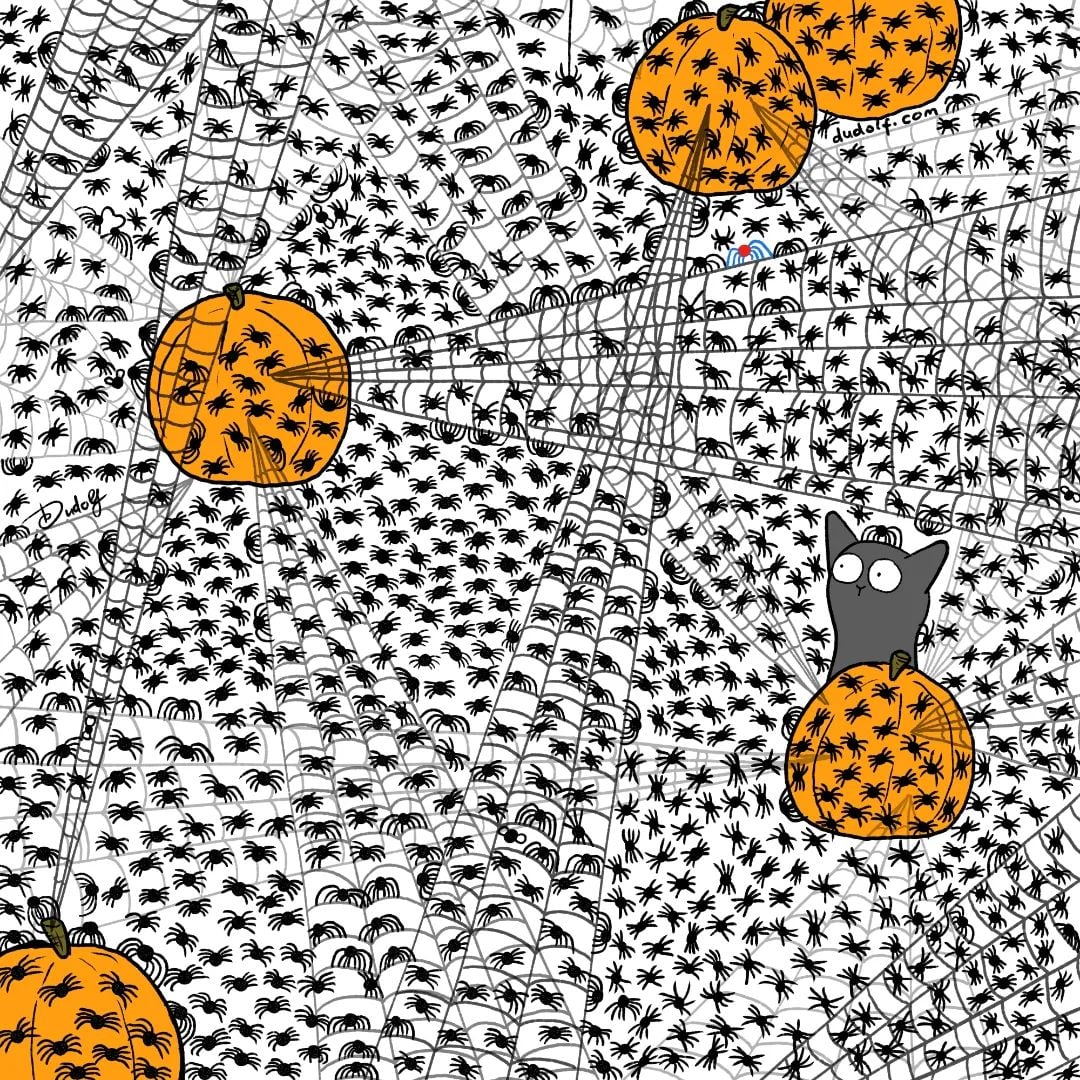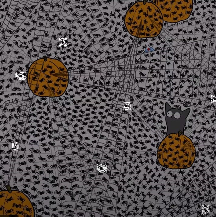 Pabandykite išspręsti neįtikėtinai internete išpopuliarėjusią galvosūkį – reikia greitai surasti muses paveikslėlyje, kuriame yra moliūgų ir daug vorų.