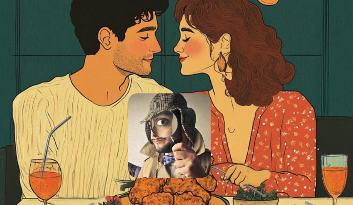 Štai romantiškos vakarienės metu maloniai bendrauja įsimylėjęs vyras ir moteris. Mergina vilki elegantišką suknelę, o vaikinas – lengvą megztinį. Ant stalo galite pamatyti taures gėrimų ir keletą skanių patiekalų. Ant įstaigos sienų kabo paveikslai, o lubose kabo lemputės.