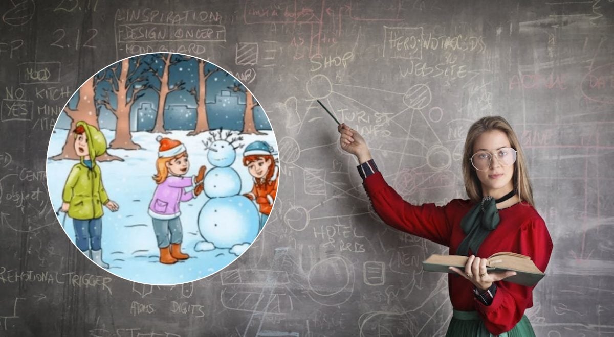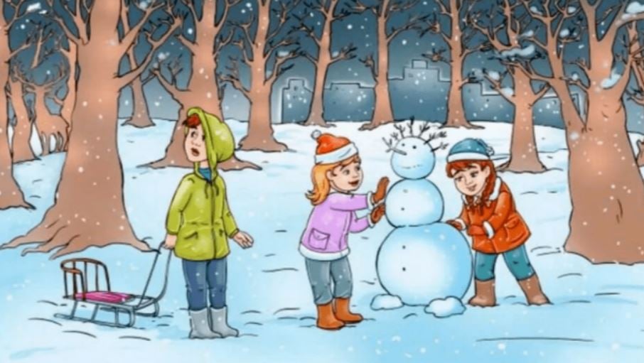 Paveikslėlyje – trys vaikai apsnigtame miške: du kuria sniego senį, o vienas laiko roges. Aplink juos auga keli medžiai. Kažkur šioje scenoje buvo pasislėpęs elnias.