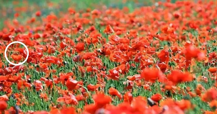 Nuotraukoje matome lauką su aguonomis. Gėlės dengia lauką kaip stora raudonai žalia antklodė, ir pabaigos nematyti. Atrodytų, šio gėlių grožio beribiškumo netrikdė nė vienas gyvūnas. Bet taip nėra – kažkur tarp gėlių slepiasi bitė, kurią pastebėti bus labai sunku.