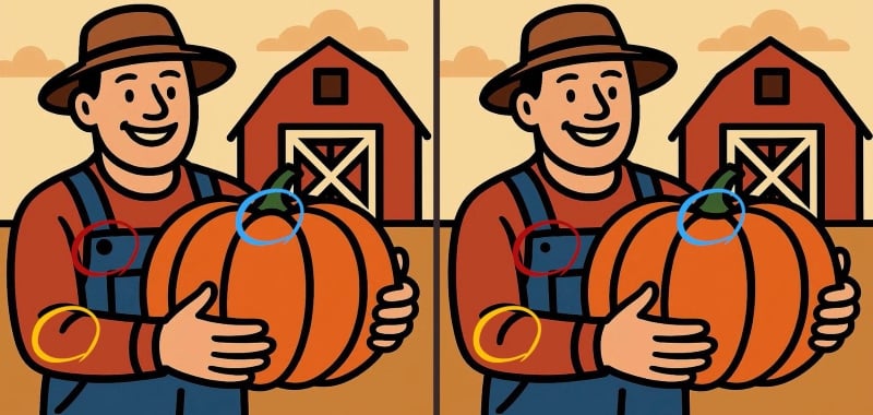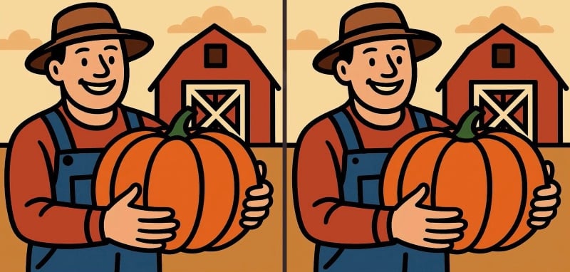 Šį kartą matote nuotrauką su ūkininku ir moliūgu. Iš pirmo žvilgsnio vaizdai visiškai sutampa, tačiau taip nėra – tarp jų slypi trys skirtumai.