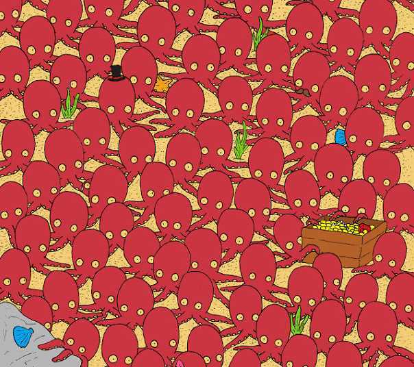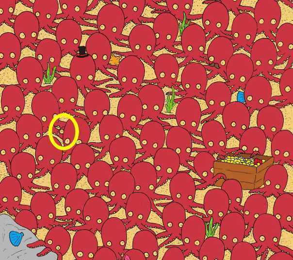 Nepavyko rasti aštuonkojo? Paimkite užuominą: pažiūrėkite į paveikslėlio centrą, o tada šiek tiek į kairę. Žuvis ten pasislėpė. Teisingas atsakymas pažymėtas geltonu apskritimu.
