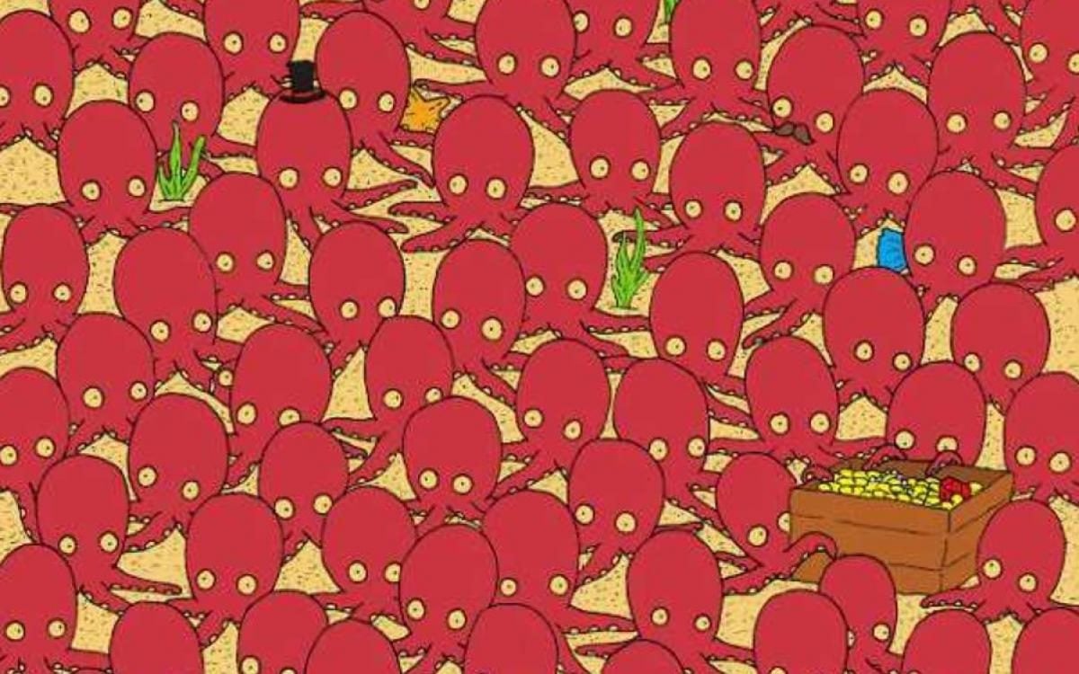 Nuotraukoje pavaizduota daug aštuonkojų, kurie, atrodo, rado auksinę skrynią. Mūsų užduotis – čia surasti žuvį.