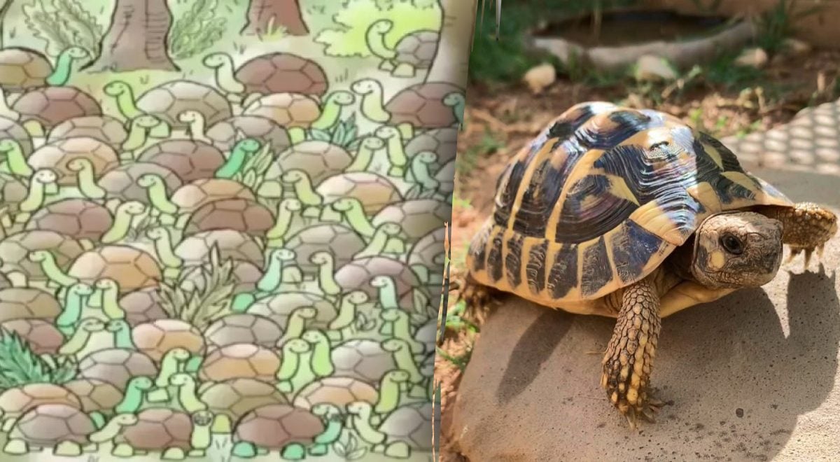 Nuotraukoje tarp medžių miške matome daug vėžlių. Iš pirmo žvilgsnio atrodo, kad nuotraukoje, be vėžlių, nėra kitų gyvūnų. Tačiau iš tikrųjų taip nėra – ten slypi gyvatė, kuri stengiasi būti nematoma tarp kitų gyvūnų ir niekam nepatraukti.