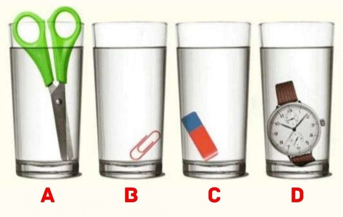 Paveikslėlyje pavaizduotos keturios stiklinės vandens, kurių kiekvienoje yra atskiras daiktas: žirklės, sąvaržėlė, trintukas ir laikrodis. Turite nustatyti, kurioje stiklinėje yra daugiau vandens.