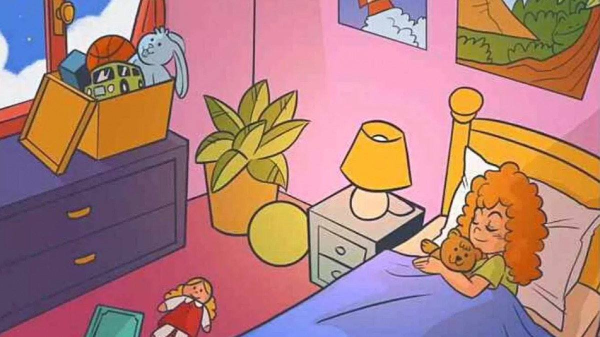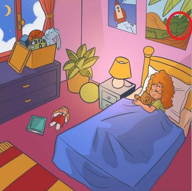 Nuotraukoje pavaizduota miegamajame mieganti mergina. Apkabina meškiuką, jos dešinėje – lėlė, sąsiuvinis, o kampe ant spintos – dėžė su kitais žaislais. Jūsų užduotis yra surasti, kur yra varlė. Ji pasislėpė labai arti.