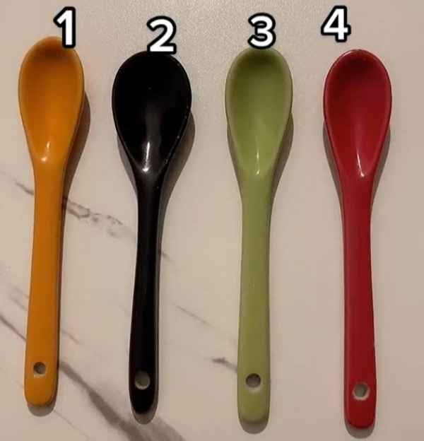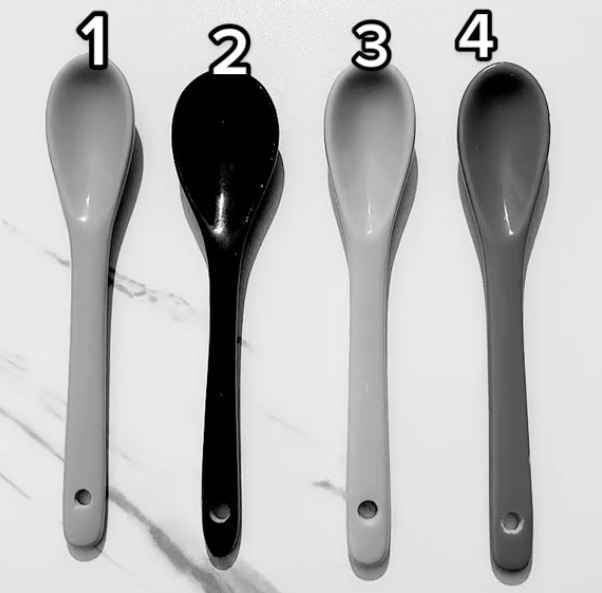 Nuotraukoje matome keturis šaukštus, kurie, be jokios abejonės, yra skirtingų spalvų. Tačiau nuotraukos sodrumas buvo pašalintas, todėl sunku iš karto suprasti, kokios spalvos yra kiekvienas iš šių atskirų objektų.
