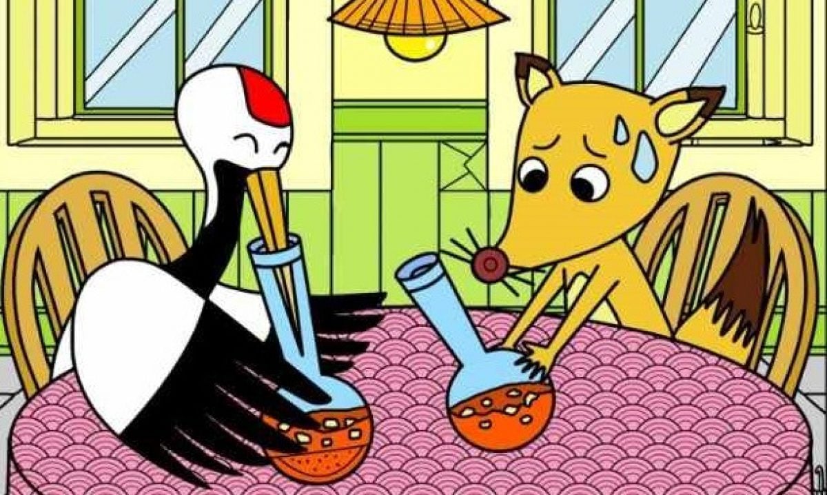 Nuotraukoje matome sceną iš garsiosios pasakos apie lapę ir gervę. Kol gervė džiaugsmingai valgo maistą iš siauros kolbos, lapė tik pavydžiai žiūri į indą, iš kurio negali gauti skanaus maisto.