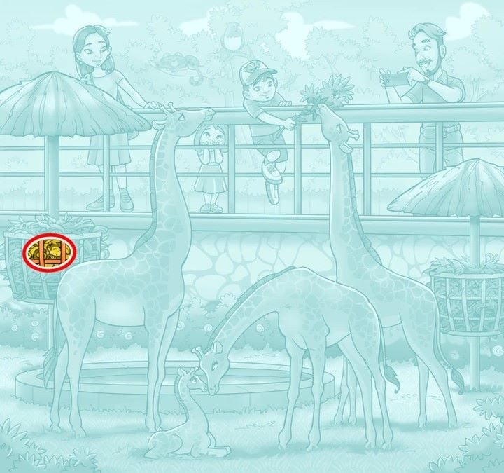 Pasak JagranJosho, piešinyje pavaizduotas zoologijos sodas. Vyras spusteli žirafų nuotraukas. Moteris ir vaikai nustemba pamatę gyvūnus. Berniukas maitina žirafą augalais. Šiame paveikslėlyje taip pat kažkur sumaniai pasislėpusi beždžionė. Pasistenkite kuo greičiau surasti beždžionę, nes šiai užduočiai atlikti turite tik 9 sekundes.